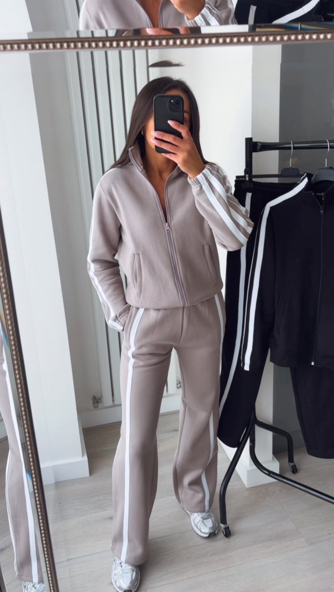 Step out in style with the Libby stripe detail jacket and jogger set. This stunning set features a zip front design jacket with stripe detail and matching joggers that offer ultimate comfort.